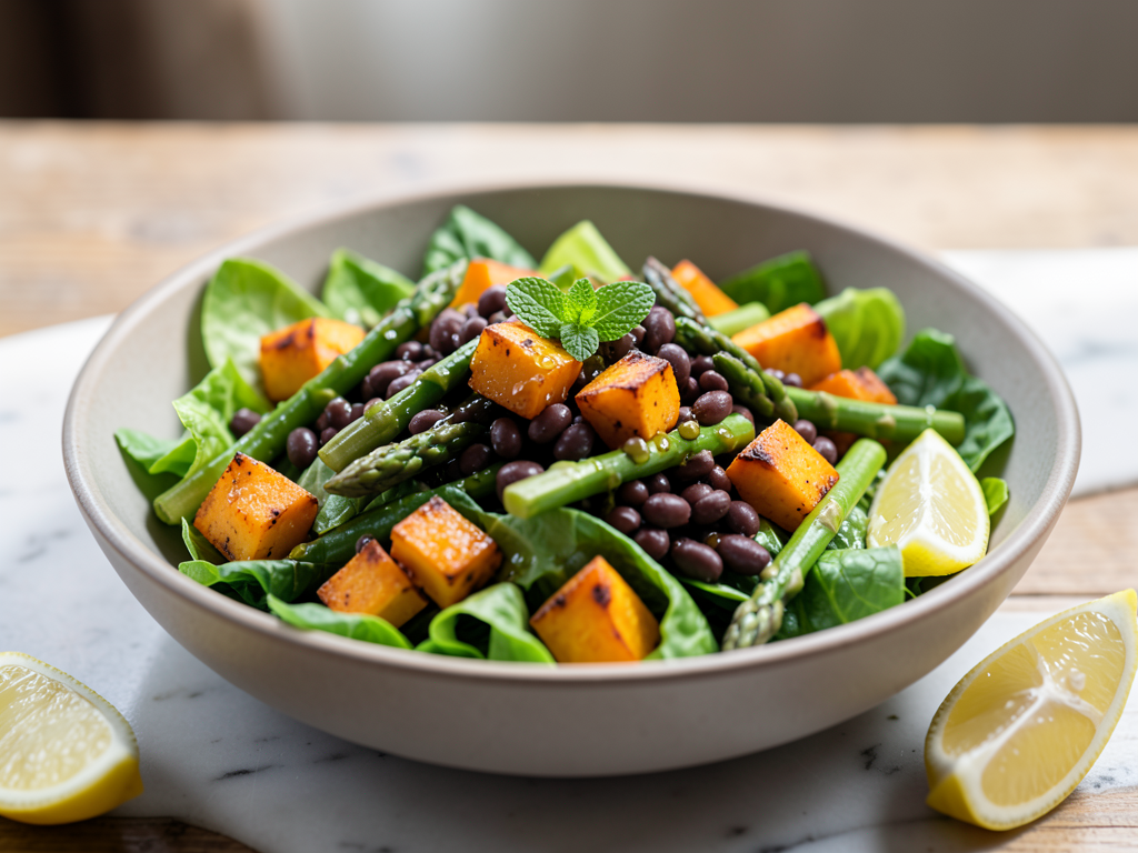 Dive into this vibrant Mediterranean Black Beans Salad with Pumpkin and Asparagus! This big bowl of freshness combines crisp romaine, sweet roasted pumpkin, and tender asparagus, all crowned with hearty black beans. The salad is dressed in zesty Mediterranean flavors and garnished with fresh mint and a lemon wedge to squeeze over the top. Feel free to get creative with your toppings and make this dish your own!