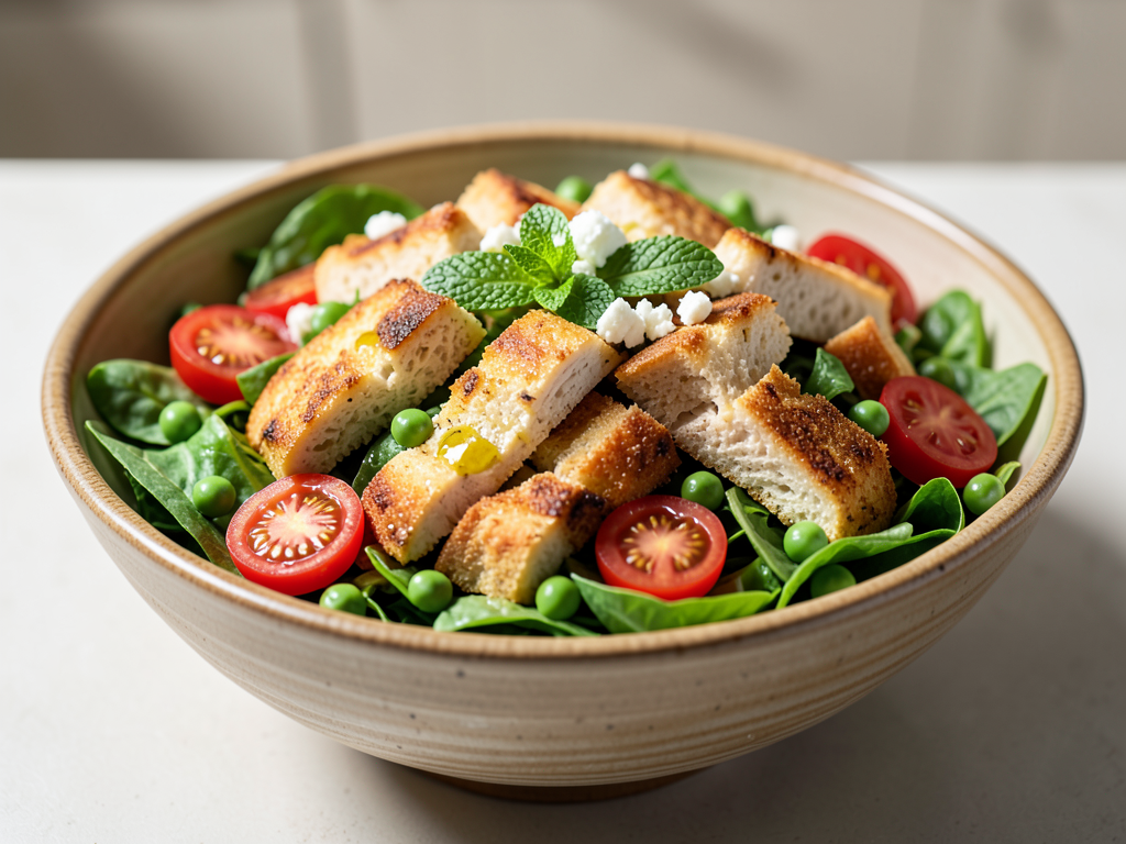 - Add the cooked chicken and toasted bread to the salad. Top it with fresh mint leaves and toss gently to combine.