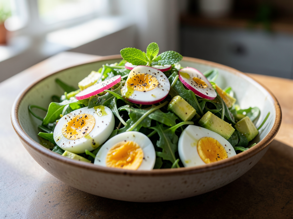 Dive into a refreshing bowl of Mediterranean goodness with our Eggs Salad topped with radishes and creamy avocado. This vibrant dish combines peppery arugula, crunchy radishes, and luscious avocado, all elegantly dressed in a zesty Mediterranean-style dressing. Finish it off with fresh mint and a sprinkle of cracked black pepper to elevate the flavors. Feel free to mix it up with your favorite greens or add extra toppings like feta or olives for an even more delightful experience!