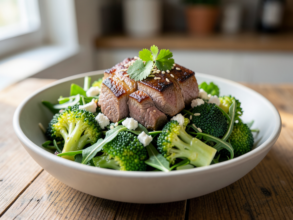 Mediterranean Lamb Salad with Broccoli and Arugula