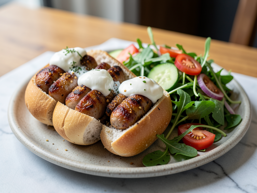 - Serve the sausages in whole wheat buns topped with a generous spoonful of yogurt or sour cream alongside the fresh salad.