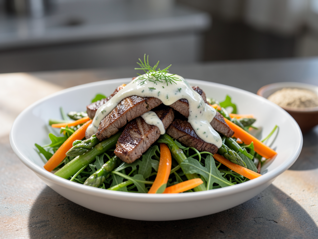 Mint Yogurt Beef Salad with Asparagus and Carrots