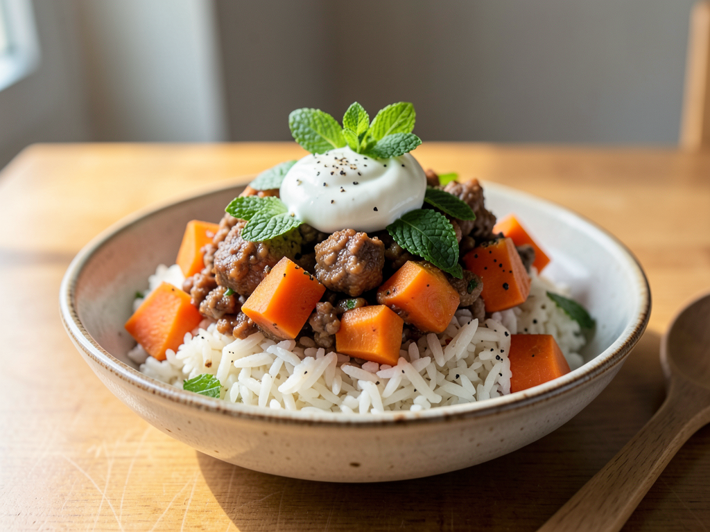 Mint Yogurt Beef Sweet Potato Rice Dish
