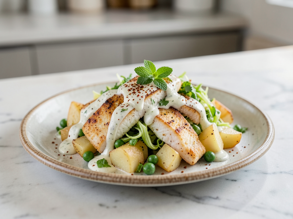 - Assemble the plate: Start with a base of fluffy rice, top with the sautéed potatoes, peas, and cabbage, followed by the baked cod. Finish by drizzling mint yogurt and tahini over the dish. Garnish with chopped cilantro and extra mint leaves if desired.