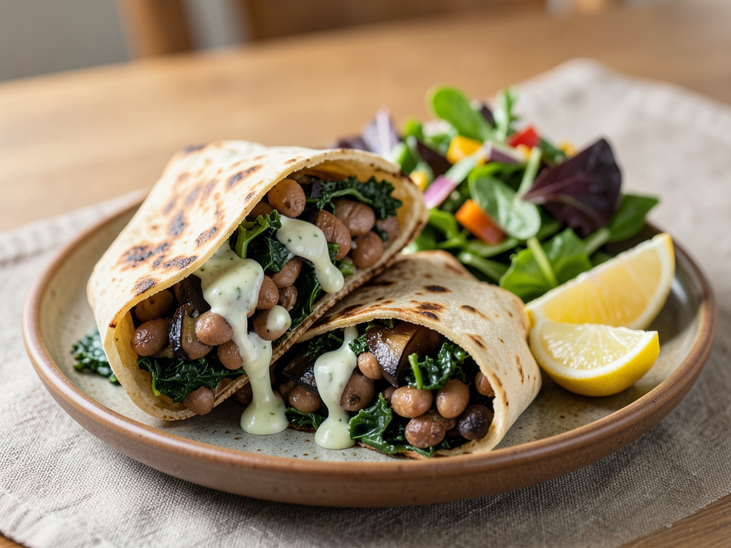 - Lay a whole wheat wrap flat and evenly distribute the kidney beans, roasted eggplant, and sautéed kale in the center. Drizzle with mint yogurt sauce.