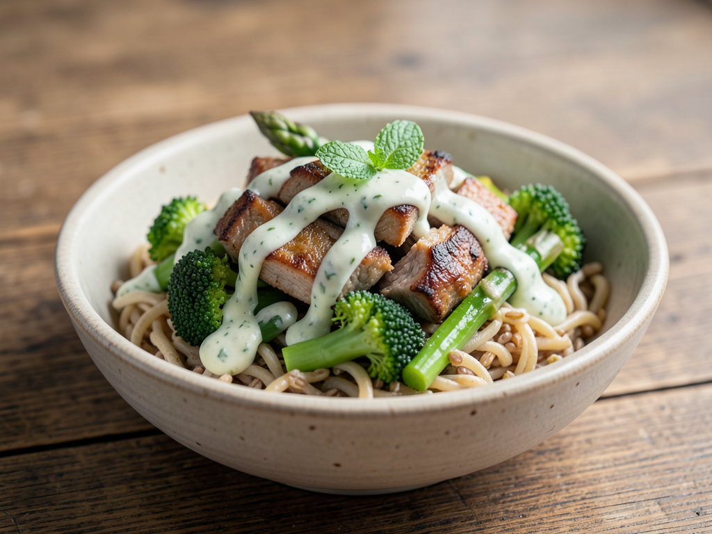 5. Divide the cooked buckwheat noodles among four bowls. Top with sautéed lamb, asparagus, and broccoli. Drizzle with the mint yogurt sauce.