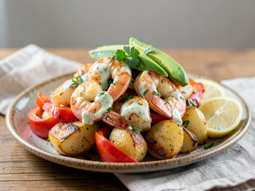 Imagine succulent shrimp marinated in a vibrant mint yogurt sauce, beautifully complemented by roasted bell peppers and creamy avocado. Served atop a bed of tender roasted potatoes, this dish is easy to prepare and so satisfying! Feel free to switch up the vegetables or herbs based on what you have on hand — cooking is all about flexibility and creativity. Let’s bring this delightful meal to your dinner table!