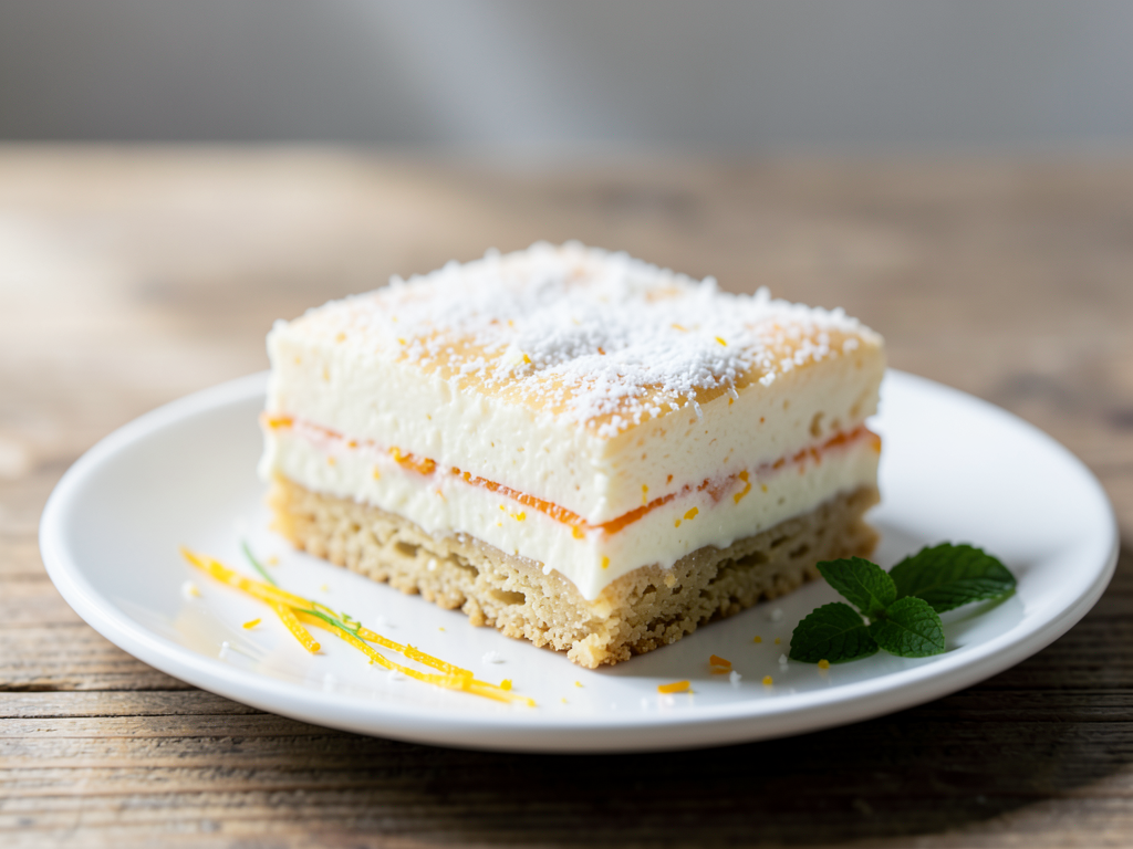 - Once set, lift the pastry out of the tray using the parchment overhang and slice into squares. Serve chilled, optionally garnishing with extra citrus zest and fresh mint leaves.