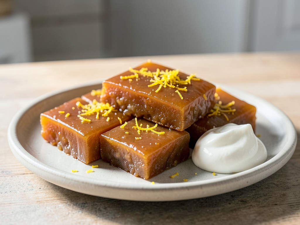 - Once the caramel is set, cut it into small squares or rectangles and serve topped with a dollop of yogurt cream and extra lemon zest, if desired.
