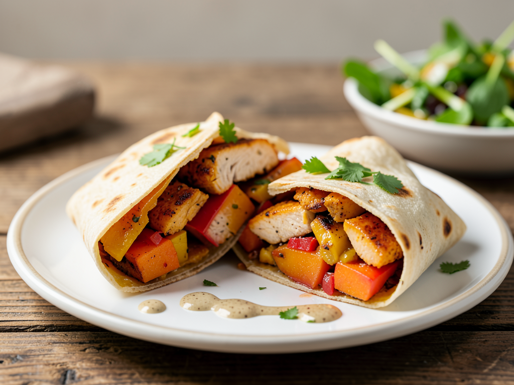 - Fill each wrap generously with the chicken, pumpkin, and pepper mixture, then fold and roll tightly.