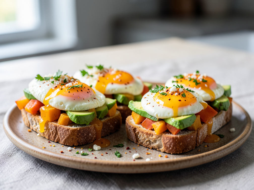 - On each slice of toast, layer the sautéed pumpkin, then top with avocado slices. Carefully place an egg on top of each open-faced sandwich.