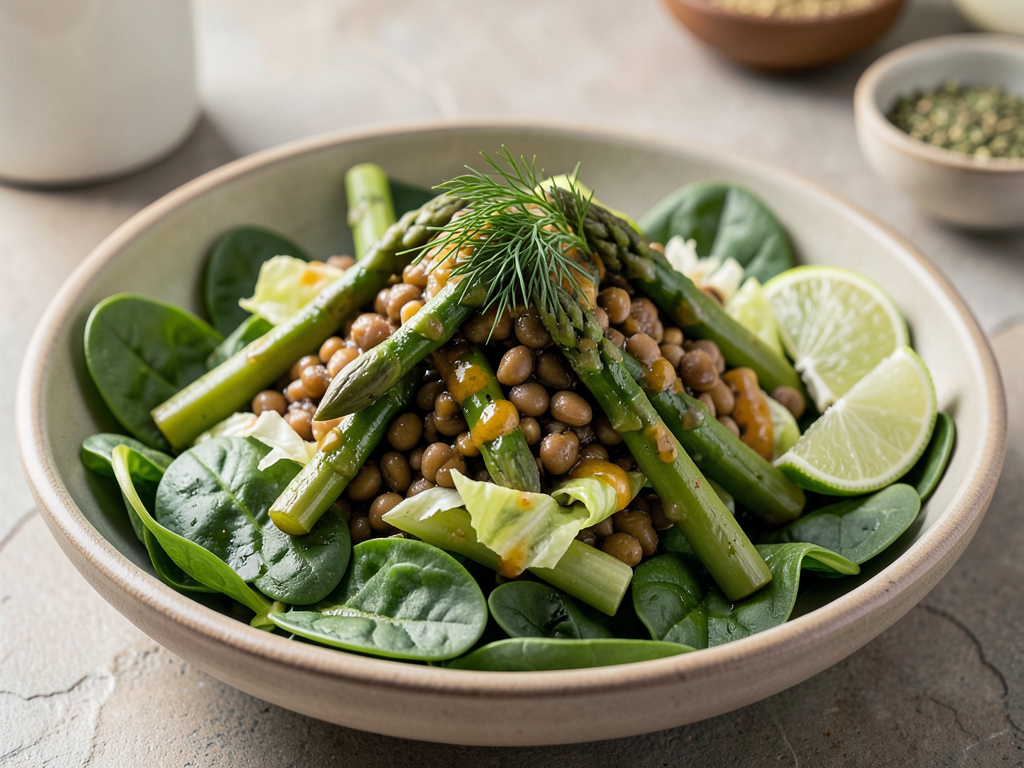 - Assemble the salad: In a large salad bowl, combine baby spinach, cooked lentils, blanched asparagus, and shredded lettuce.