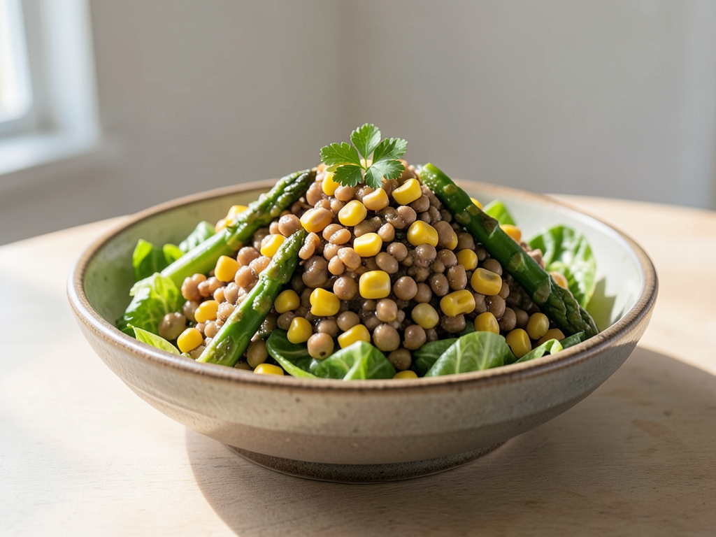 - In a mixing bowl, combine the cooled lentils, corn, asparagus, and chopped romaine lettuce.