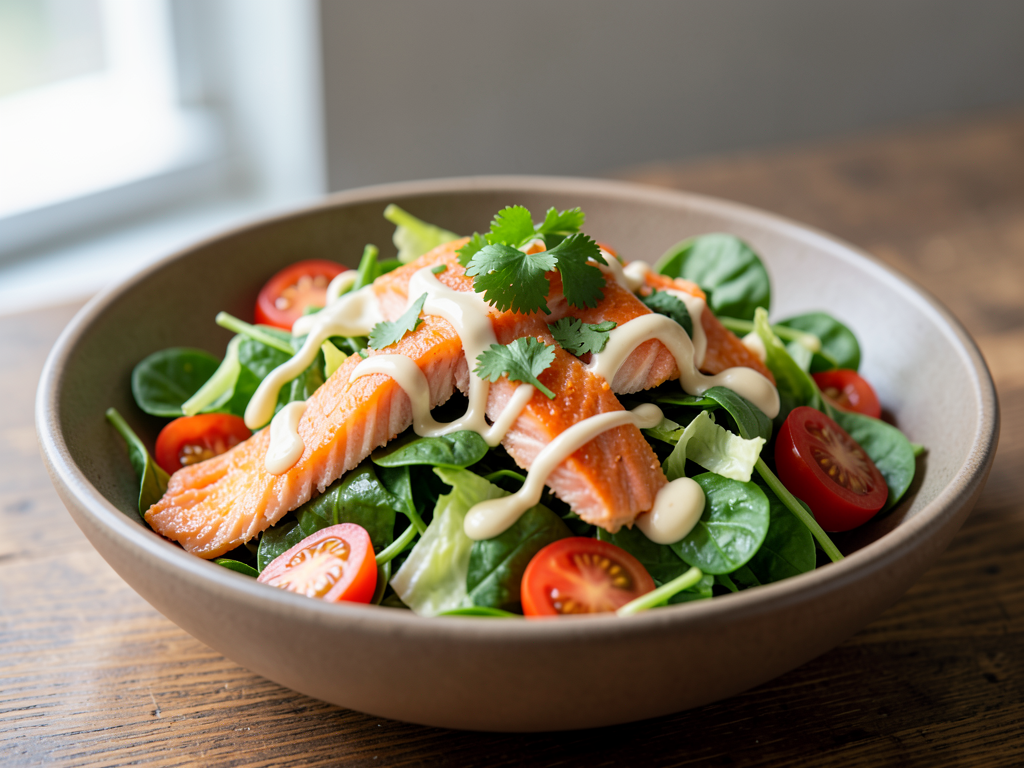 Indulge in a vibrant and refreshing Orange Cumin Salmon Salad that's perfect for a healthy, low-carb meal! This big salad bowl features a delightful combination of baby spinach, fresh tomatoes, and crunchy cabbage, generously topped with succulent salmon. The zesty orange cumin dressing brings a burst of flavor, while a sprinkle of freshly chopped cilantro adds a lovely touch. Complete the dish with a drizzle of creamy tahini for an extra layer of taste. Feel free to get creative with the ingredients—add your favorite greens or switch up the protein for a personal twist!