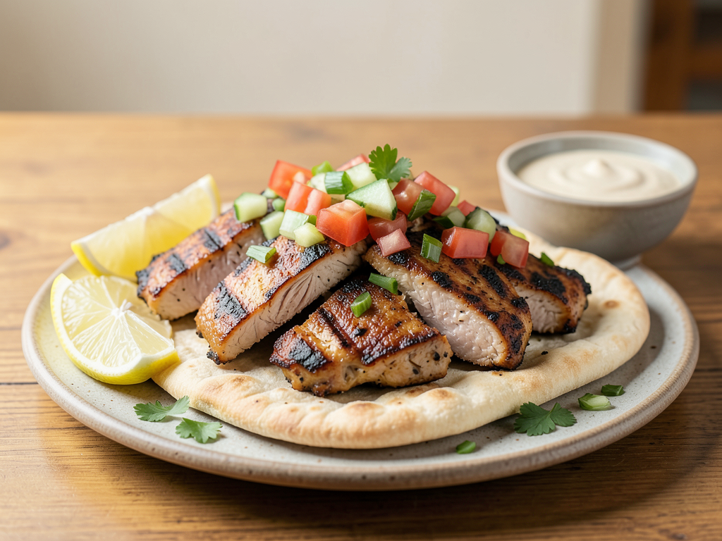 - To serve, place sliced chicken on the warm pita, and top with diced cucumber, tomatoes, and chopped green onions.