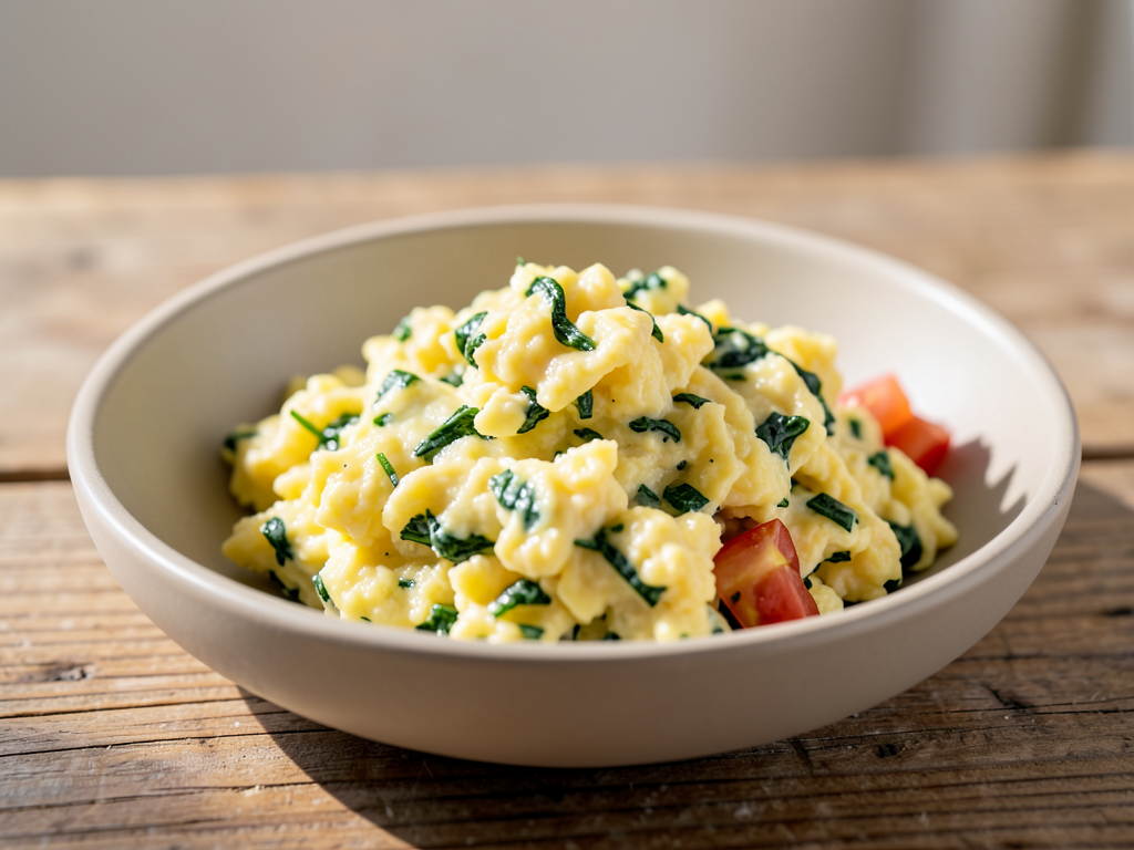 - Cook for about 5 minutes, stirring occasionally, until the eggs are soft, creamy, and fully cooked through. If using cheese, fold it in at the last minute.