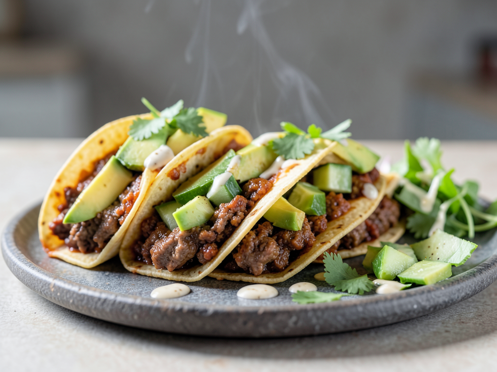 - Assemble the tacos by placing a generous spoonful of the smoky beef mixture on each tortilla. Top with sliced avocado and diced cucumber.