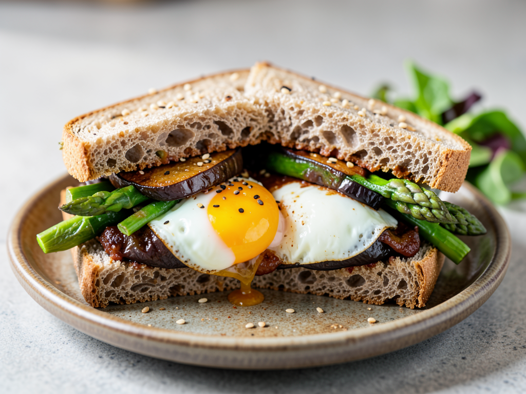 5. Toast the whole grain bread slices. On one slice, layer the smoky eggplant, sautéed asparagus, and top with the fried egg. Drizzle with a bit of chili sauce if desired. Cap with another slice of bread.