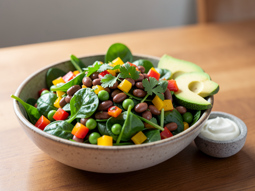 - In a large mixing bowl, combine the baby spinach, peas, diced red and yellow bell peppers, and kidney beans. Toss gently to combine.