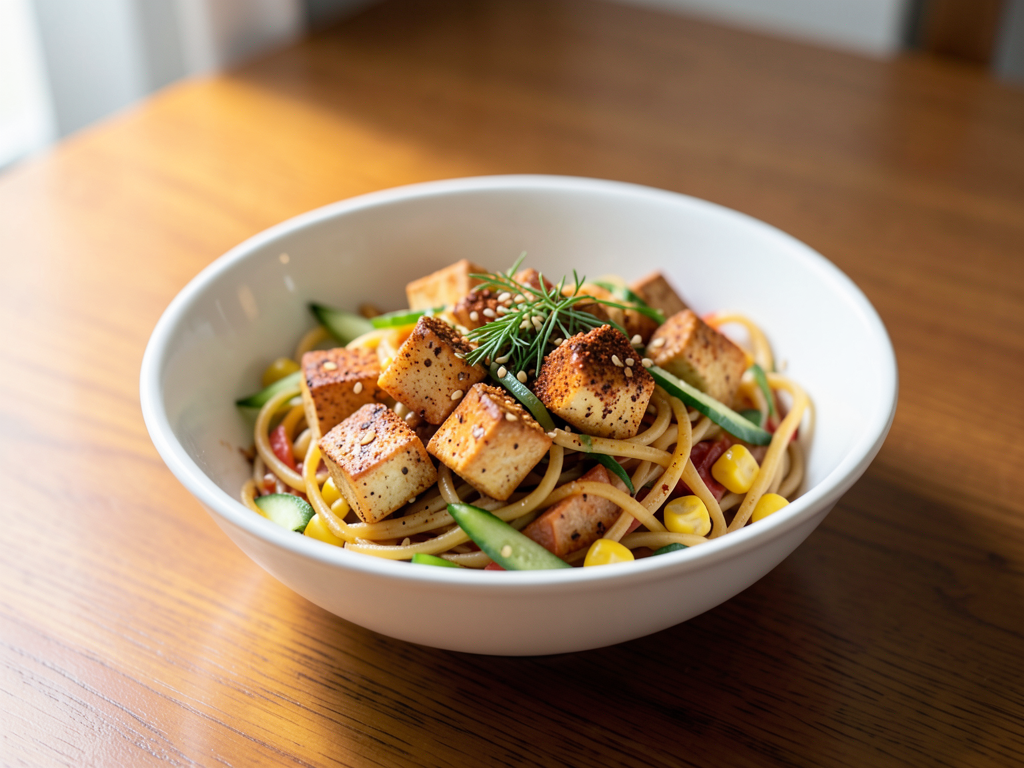 Welcome to the delightful world of flavors with our Smoky Chili Tofu Noodles Pasta Bowl! This refreshing dish blends perfectly cooked noodles and protein-rich tofu with vibrant cucumber and sweet corn, adding a pop of color and crunch. Finished with a sprinkle of fresh dill and sesame seeds, this bowl is not only visually appealing but also nutritious and satisfying. Feel free to get creative with your veggie choices or add your favorite herbs to tailor it just the way you like!