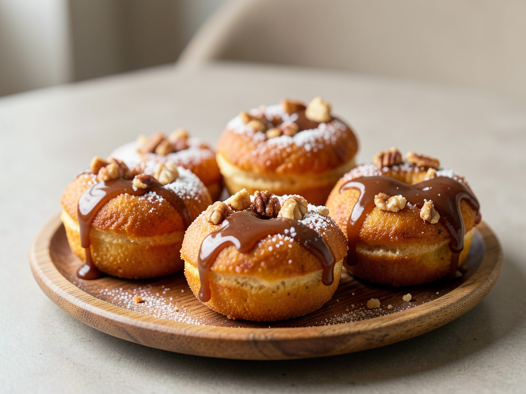 8. Drizzle the date caramel over the warm doughnuts and, if desired, dust with powdered sugar and sprinkle with chopped nuts for extra crunch.