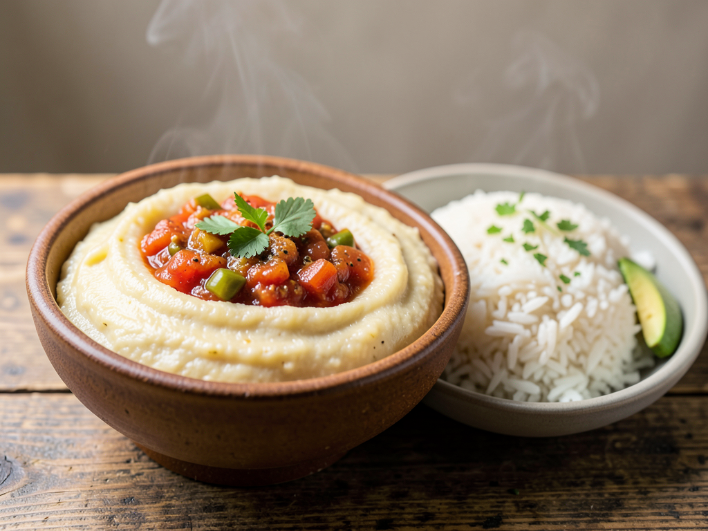 - Spoon the pap onto plates, top with the spicy relish, and serve alongside the rice. Garnish with fresh coriander and optional toppings like sliced avocado or chopped spring onions.