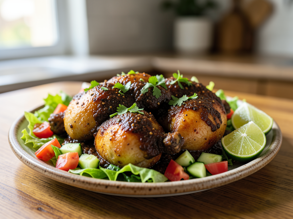 - Serve the chicken mole on a platter, generously spooning extra sauce over the top. Arrange the fresh salad on the side. Garnish with chopped cilantro and lime wedges.