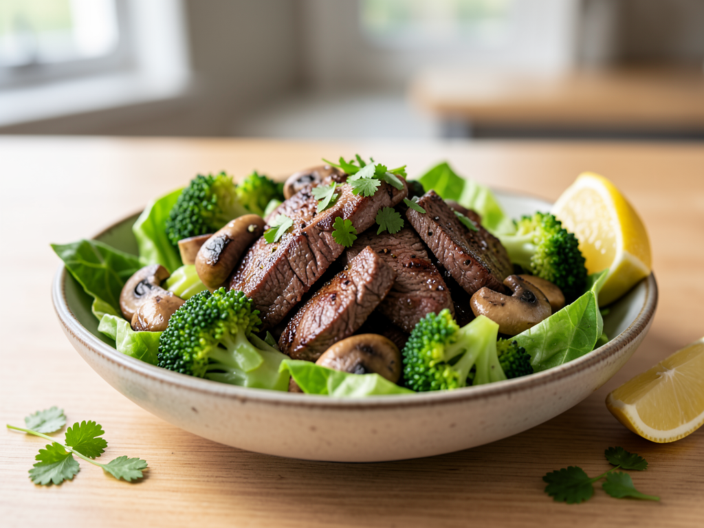 - Arrange the sliced beef on top of the salad, garnish with chopped cilantro, and serve with lemon wedges on the side. Enjoy fresh!