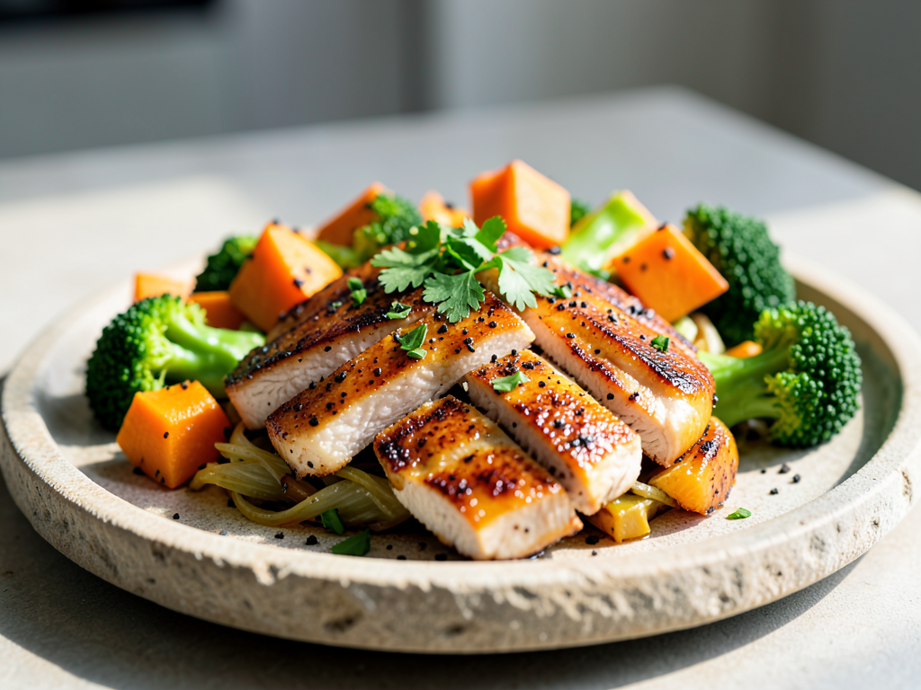 - While the veggies are roasting, heat a grill or frying pan over medium-high heat. Cook the marinated chicken for about 5–6 minutes on each side or until fully cooked and golden brown.