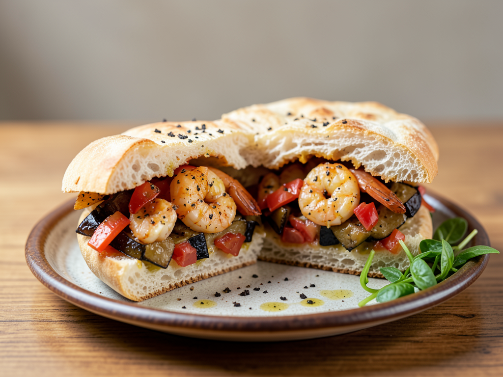 - Stuff the warm pita with the shrimp and eggplant mixture. Garnish with chopped parsley and cracked black pepper, if desired.