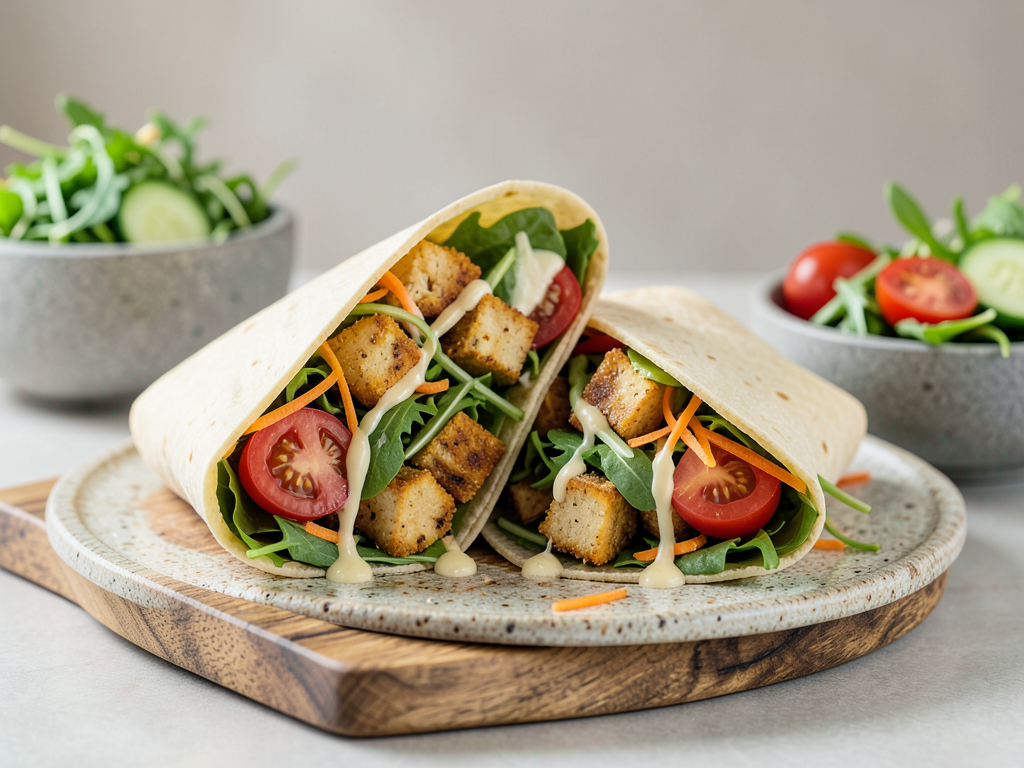 - Lay out a tortilla, place a generous amount of sautéed tofu in the center of each wrap, followed by a handful of the mixed salad vegetables. Drizzle over some tahini lemon sauce.