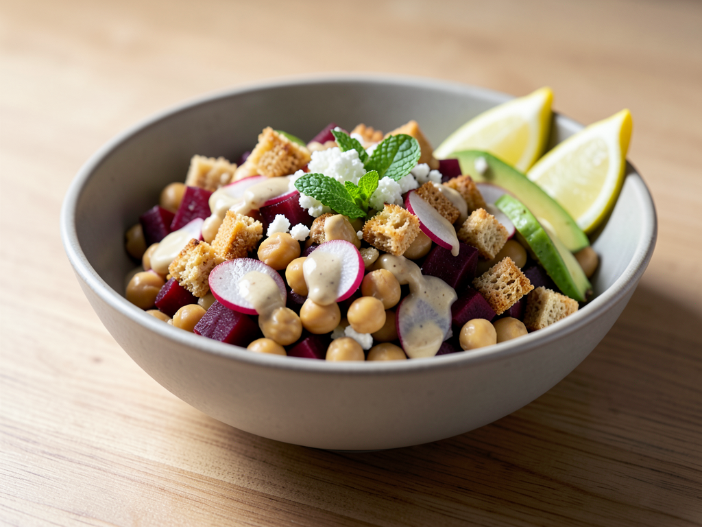 - In a large mixing bowl, combine the chickpeas, diced beets, sliced radishes, and fresh mint.