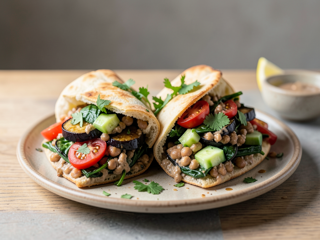 6. To assemble the bowls, slice the pita in half and fill each pocket with the eggplant and spinach mixture, followed by the tahini kidney bean mix.