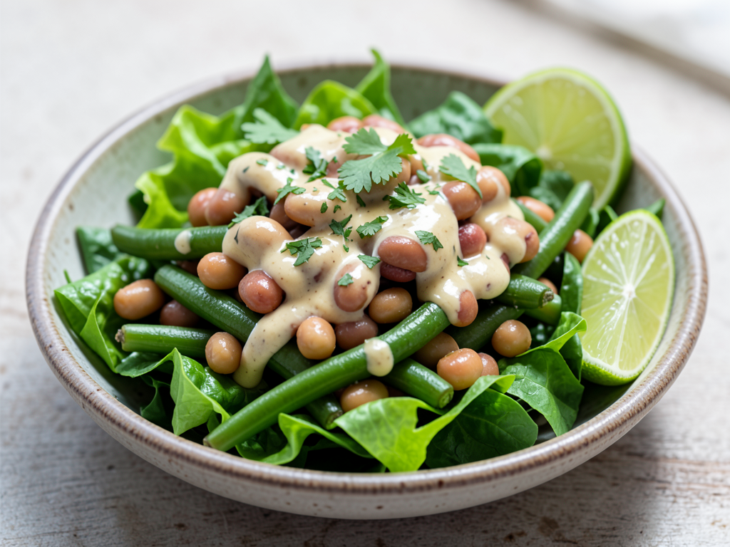 Welcome to a vibrant and nutritious Tahini Lemon Kidney Beans Salad! This delightful salad features a generous mix of crisp romaine lettuce, tender green beans, and fresh spinach, all topped with protein-rich kidney beans. The luscious tahini lemon dressing adds a creamy and zesty twist, while a sprinkle of chopped cilantro and a lime wedge on the side elevate this dish even more. Feel free to customize with your favorite greens or herbs!