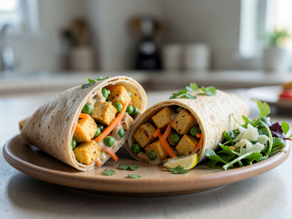 - Divide the tofu-vegetable mixture evenly among the wraps, then roll them up tightly.