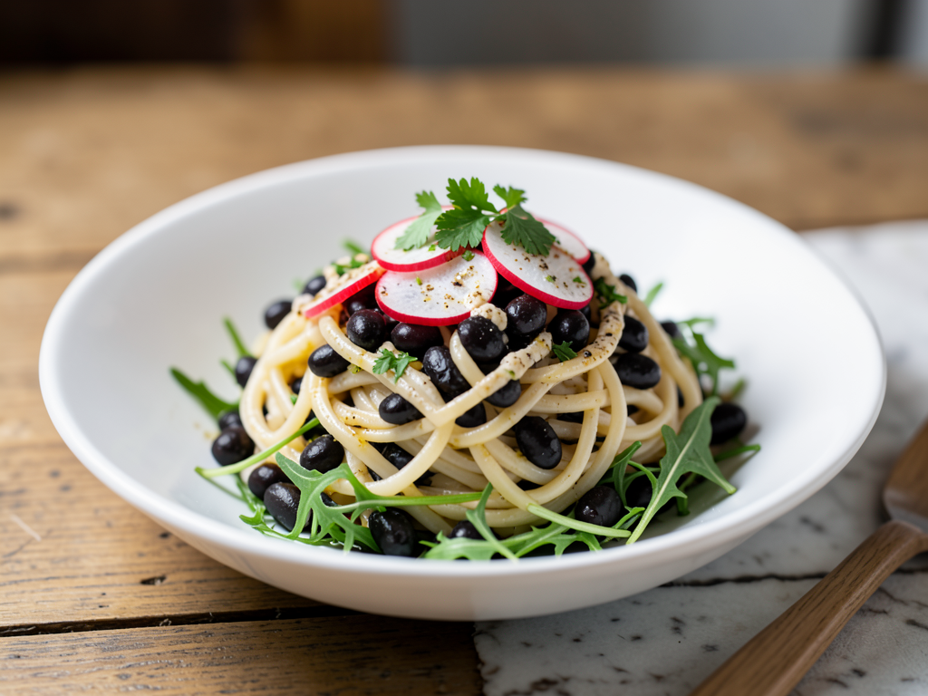 Welcome to a light yet fulfilling meal that takes the best of both worlds! This delightful pasta bowl brings together the hearty texture of black beans and the unique chewiness of shirataki noodles. With vibrant arugula and crunchy radishes adding color and texture, this dish is finished with a sprinkle of fresh parsley and a luscious drizzle of tahini. Feel free to play around with the ingredients by adding your favorite vegetables or proteins to customize it to your liking!