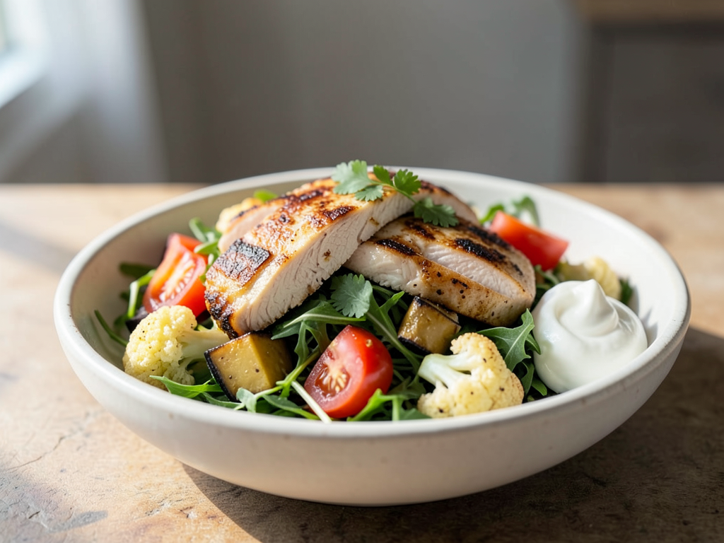 Dive into a refreshing bowl of Tomato Basil Chicken Salad with Eggplant and Cauliflower! This vibrant salad combines peppery arugula with roasted eggplant and cauliflower, all beautifully topped with succulent chicken and dressed in a homemade tomato basil dressing. Finish it off with a sprinkle of fresh parsley and a side of creamy yogurt for a wholesome meal that’s not only low in sodium but packed with flavor. Feel free to switch up the greens or add your favorite nuts for an extra crunch!