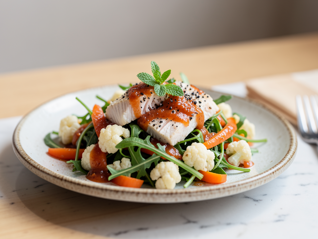 Welcome to a refreshing take on salads with our Tomato Basil Cod Salad! This vibrant bowl brings together the crunchiness of arugula, the hearty bite of cauliflower, and the sweetness of carrots, all topped with perfectly seasoned cod. Dressed in a delightful tomato basil sauce and garnished with fresh mint and a sprinkle of cracked black pepper, this dish is not only filled with flavor but also packed with nutrition. Feel free to get creative—swap in your favorite veggies or adjust the seasonings to suit your taste!