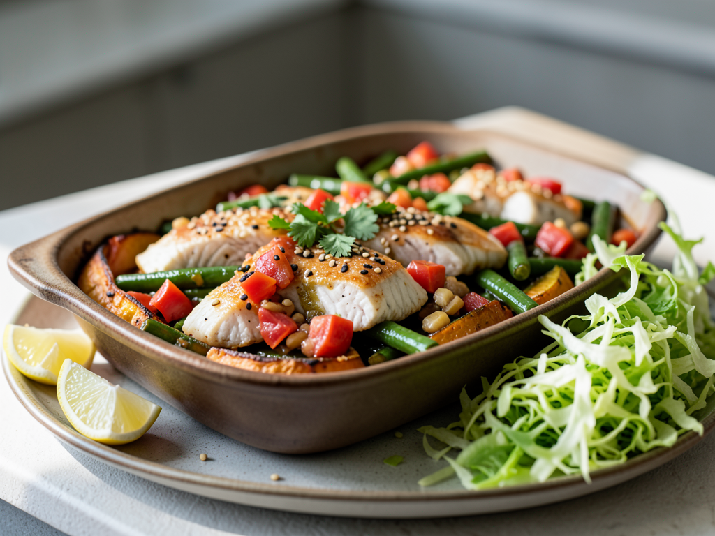 Tomato Basil Cod Sweet Potato Family-Style Bake