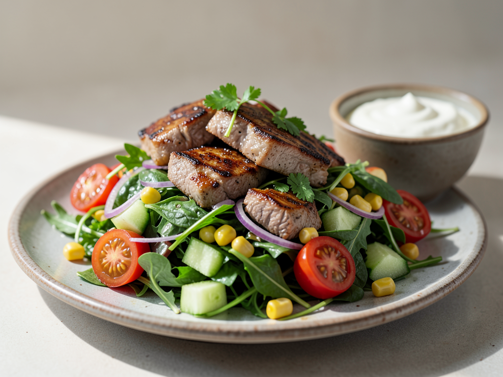 - Transfer the salad to a serving platter. Top with the diced lamb and garnish with fresh parsley. Serve with a spoonful of plain yogurt on the side. Enjoy fresh!