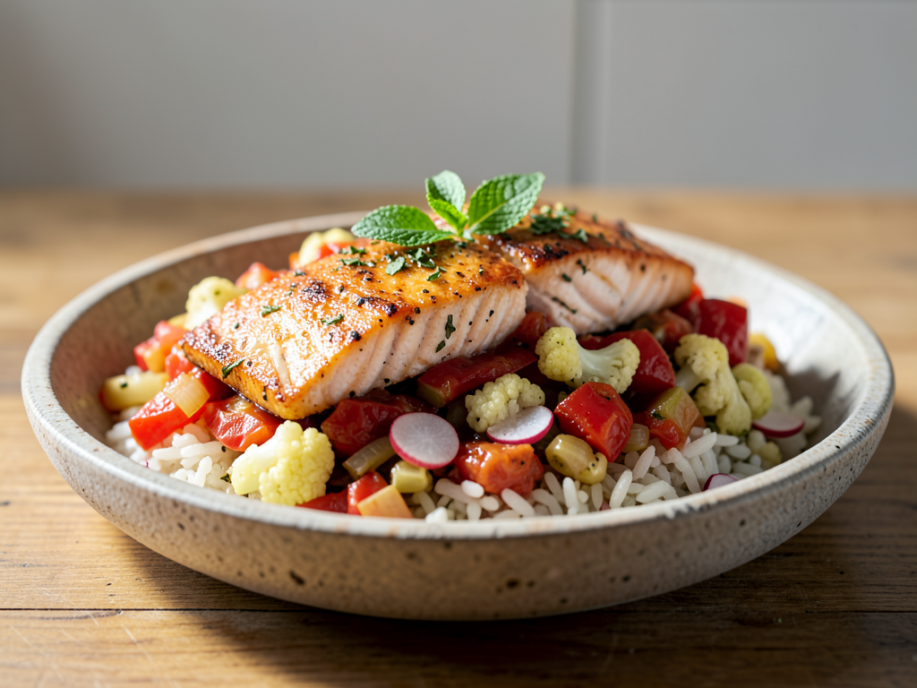 Indulge in a vibrant and refreshing dish that combines the succulent flavors of salmon with a delightful tomato basil sauce. This Tomato Basil Salmon Rice Bake is complemented beautifully by radishes and cauliflower, creating an irresistible contrast in textures and tastes. Perfect for a quick and satisfying meal, feel free to experiment with your favorite herbs or veggies to make it your own!