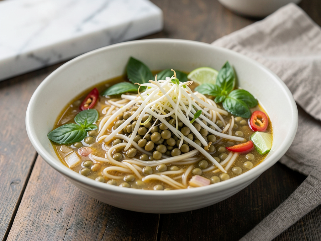 - To serve, place a portion of noodles in a bowl, ladle over the hot broth with lentils, and top with bean sprouts, fresh basil leaves, and sliced chili peppers if using.