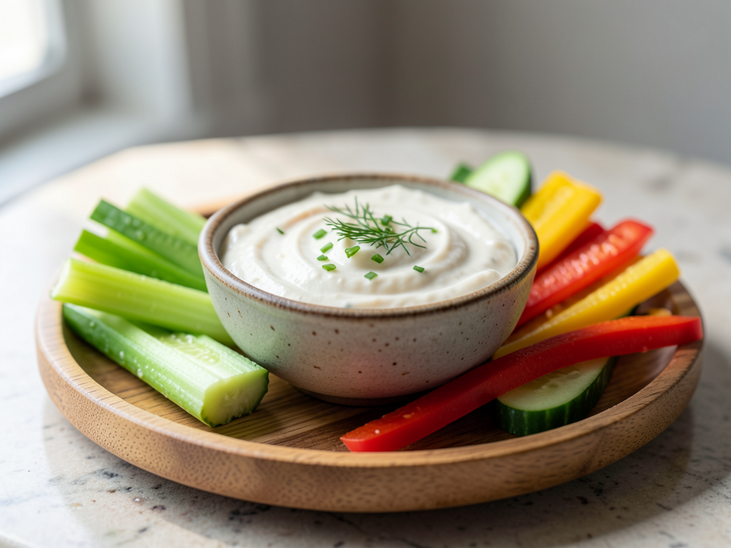 - Transfer the yogurt dip to a small bowl and place it in the center of your serving plate surrounded by the vegetable sticks.