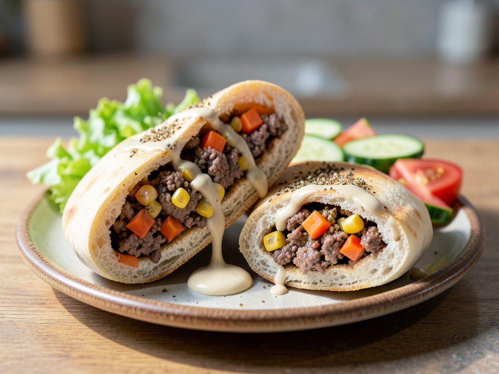 - Carefully cut each pita in half and stuff each half with the beef mixture.