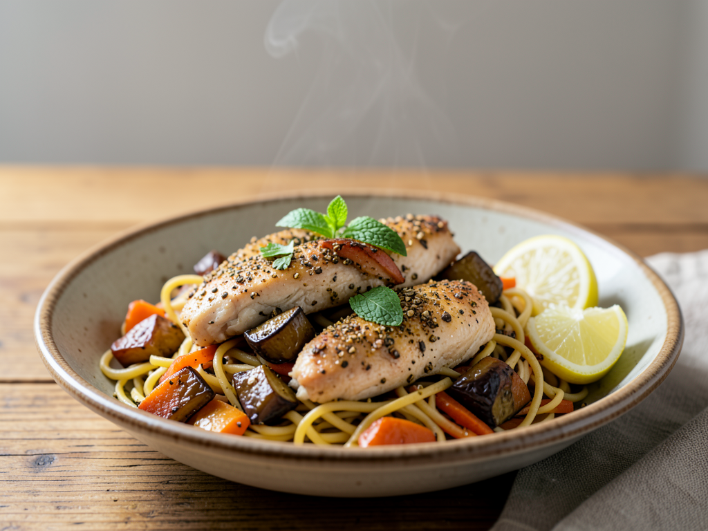 - Stir in the diced eggplant and sliced carrots. Cook for another 8–10 minutes, or until the vegetables are tender and the chicken is cooked to an internal temperature of 75°C (165°F).