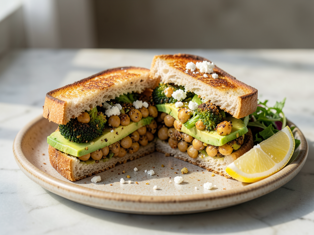 - Assemble the sandwich by spooning the chickpea and broccoli mixture onto one slice of toasted bread. Layer with slices of avocado on top. Add feta cheese, if using.