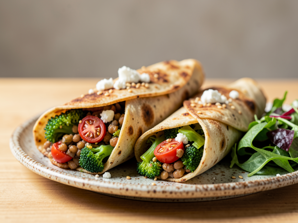 - Spoon the lentil mixture into the center of each wrap, sprinkle with optional feta cheese and sesame seeds, then fold and roll tightly.