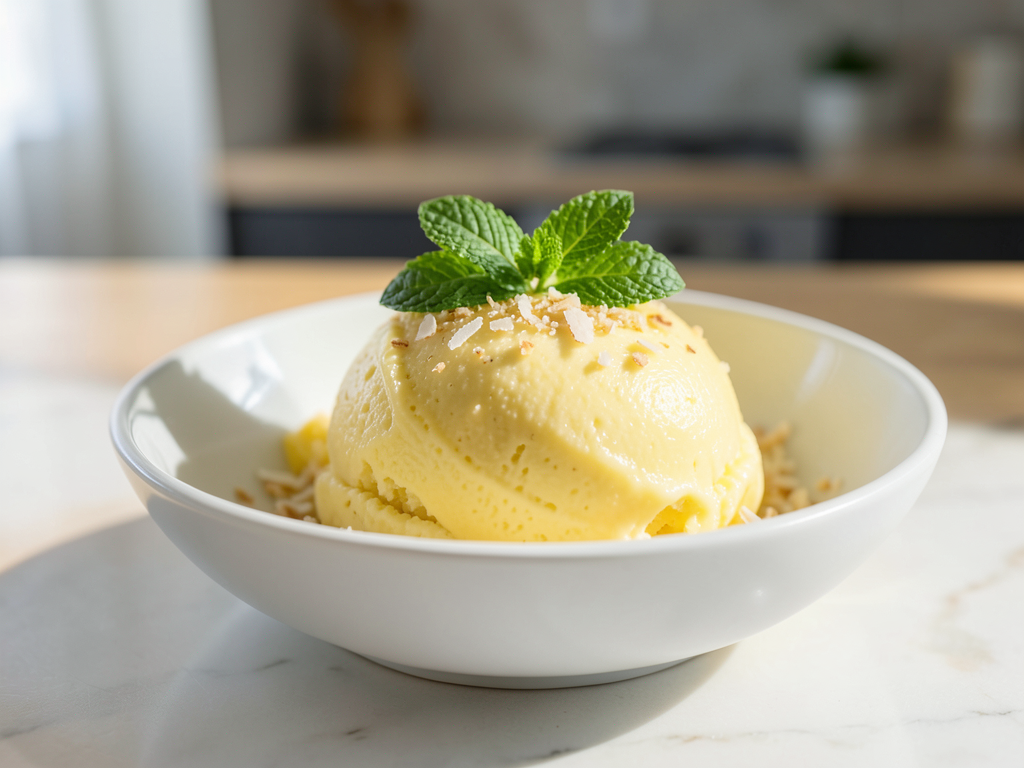 - Scoop into bowls and garnish with fresh mint or toasted coconut if using.