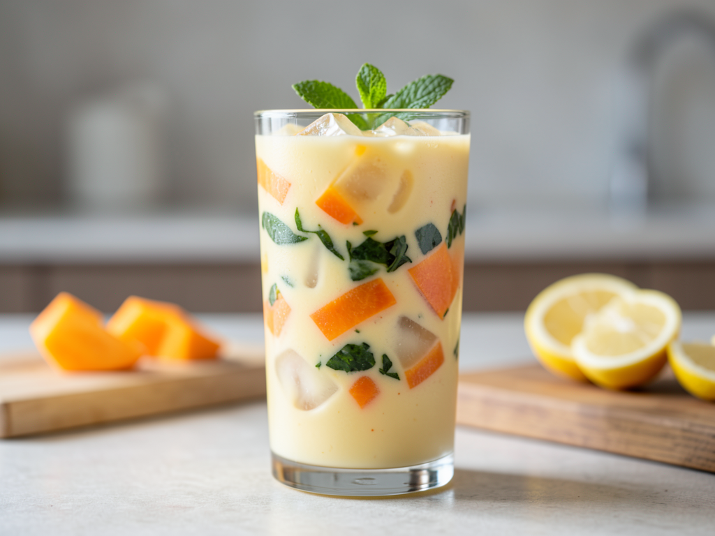 - In a blender, combine diced mangoes, chopped carrots, spinach, rice milk, and fresh lemon juice. Blend until smooth. If you prefer, you can strain the mixture through a sieve to achieve a smoother texture.